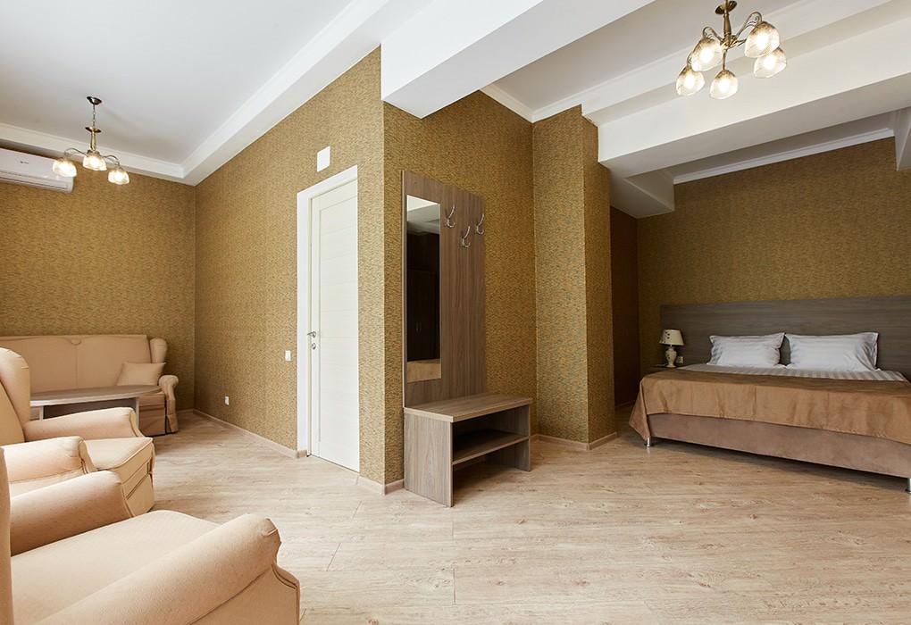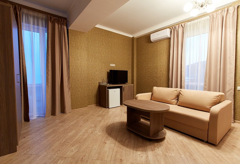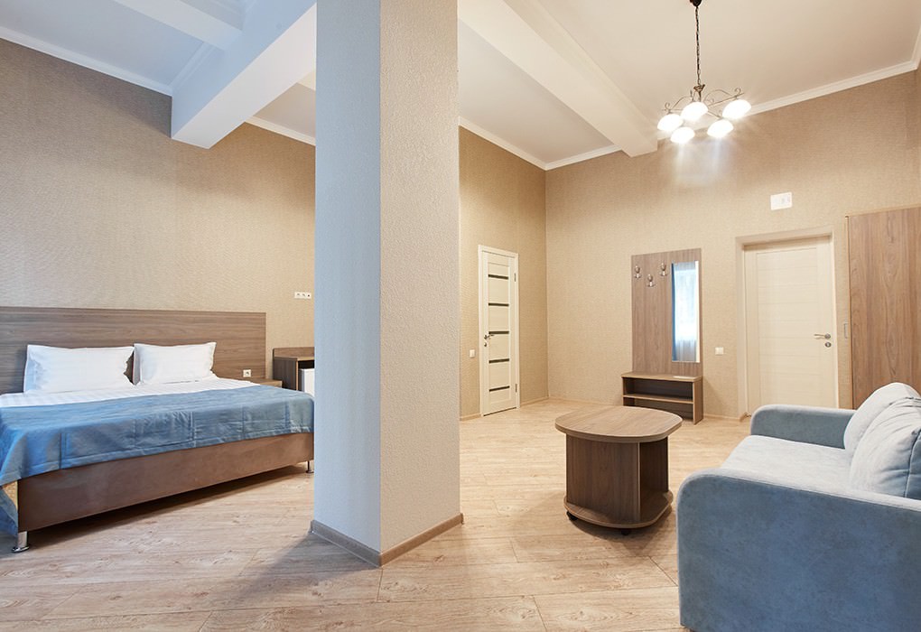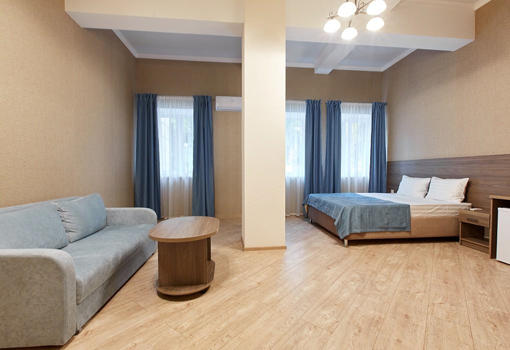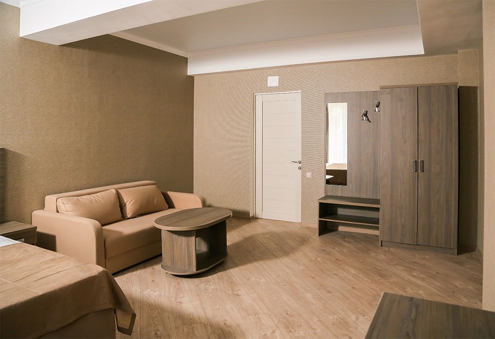 Площадь номера - 32 кв.м. 1 комната. 2 осн. места. В номере: телевизор; холодильник; кондиционер; душ; туалет; фен; Wi-Fi; туалетные принадлежности; стол; чайник; шкаф; прикроватная тумбочка; посуда (графин, стаканы). 2 доп. места: Диван-кровать - может быть установлен без ограничения по возрасту.