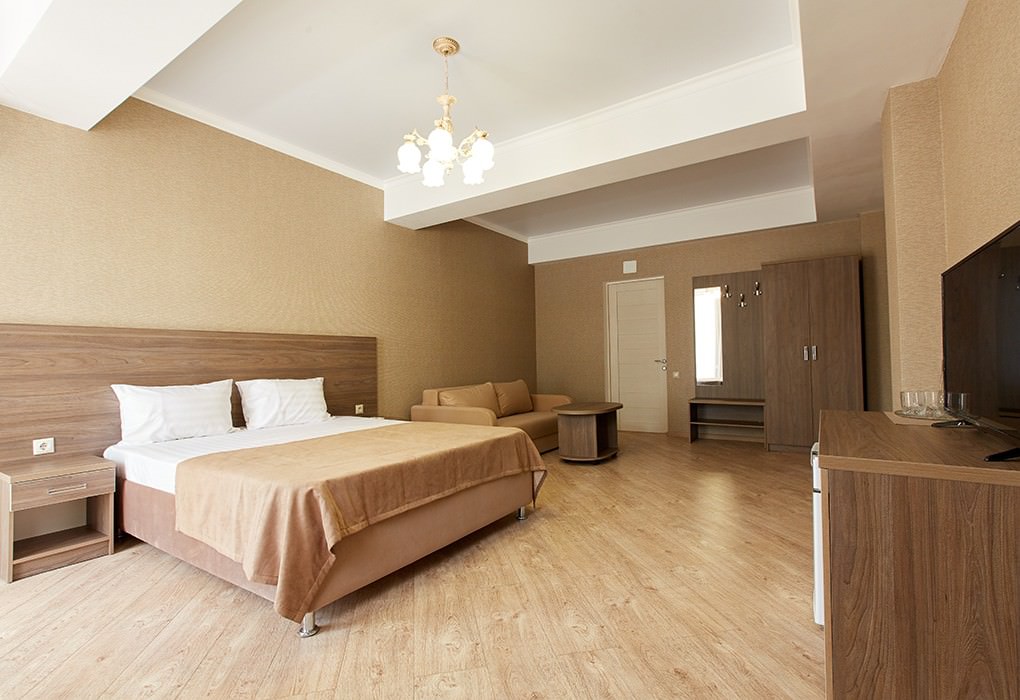Площадь номера - 23 кв.м. 1 комната. 2 осн. места. В номере: телевизор; холодильник; кондиционер; душ; туалет; фен; Wi-Fi; туалетные принадлежности; стол; чайник; шкаф; прикроватная тумбочка; посуда (графин, стаканы). 2 доп. места: Диван-кровать - может быть установлен без ограничения по возрасту.